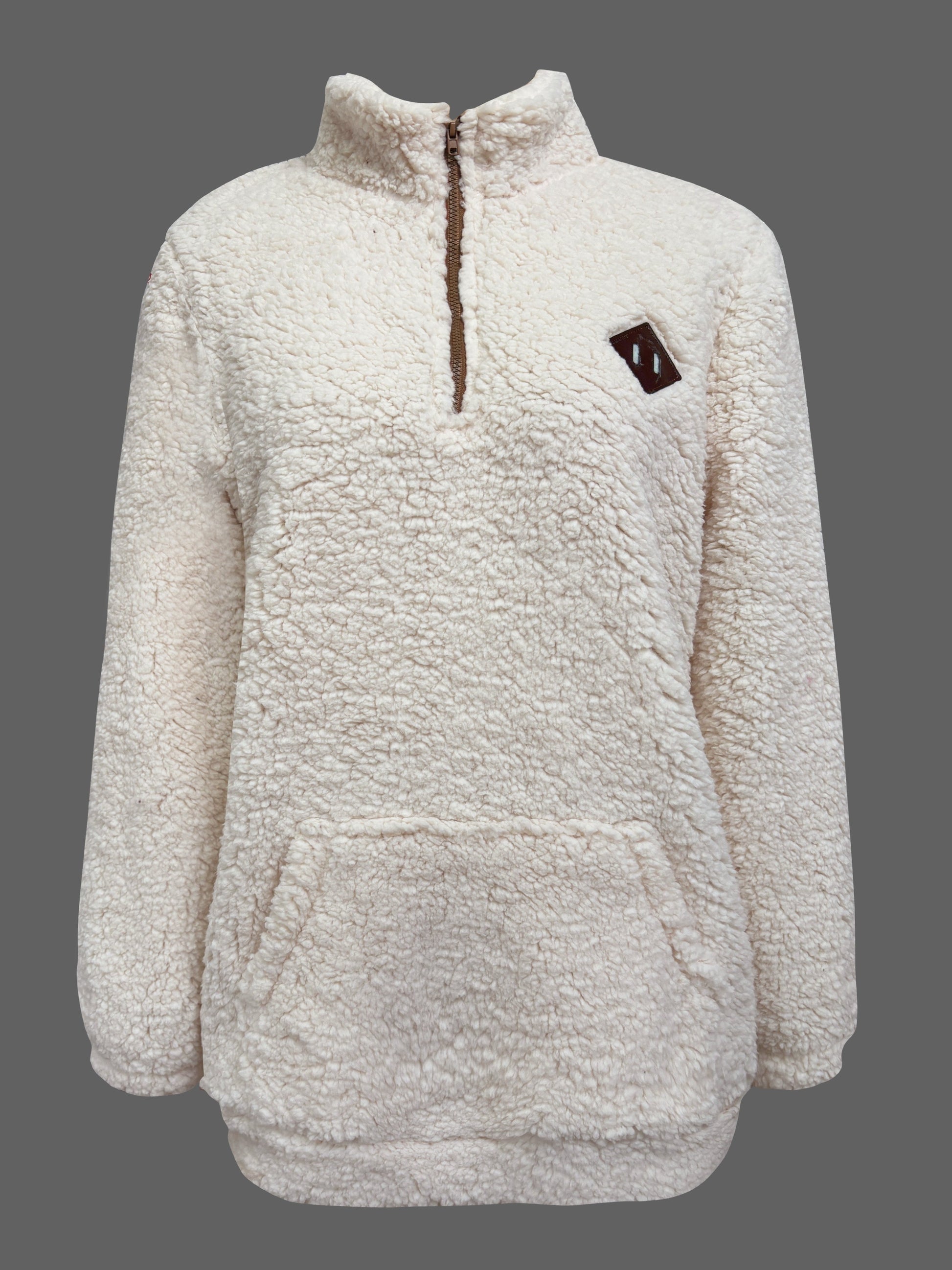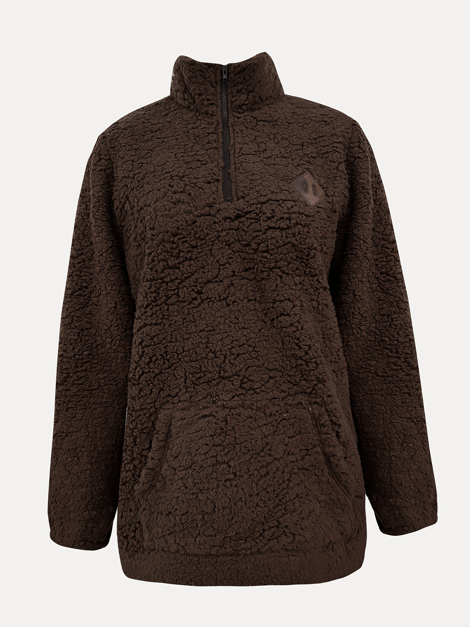 Realizat dintr-un material moale și călduros, puloverul se distinge prin pasformă lejeră, care permite libertate de mișcare. Fermuarul de la gât nu doar că adaugă un element sportiv, dar oferă și opțiunea de a purta gulerul deschis sau închis, în funcție de preferințe. Buzunarele practice completează designul, aducând un plus de funcționalitate și căldură, fiind ideale pentru a păstra mici obiecte la îndemână.
